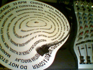 The first track is an exceprt from Christian Marclay's 1985 "record without a cover" - sounds of manipulated records played on multiple turntables.