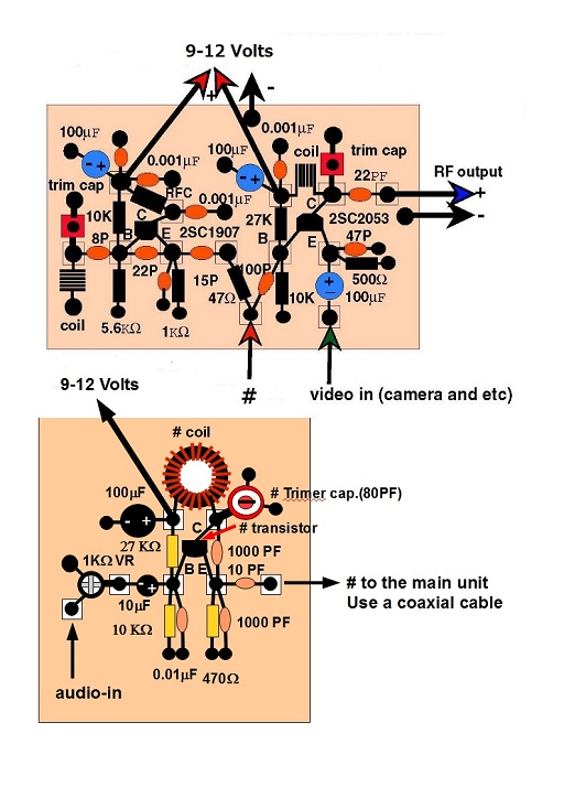 This schmetic consists of the two sections: the one seems to be a video transmitter while the other is for audio amplifying. In fact, however, these are both transmitters. The main one generates video carrier while the smaller one generates the exact 4.5 (5.5 in some countries) MHz FM audio carrier. When it is supplied to the main section, the conbination generates the audio carrier that is the total of the video frequency plus 4.5 MHz (this is the same in the US but different in other countries: 3.5 in the UK, 5.0 in Italy, 5.5 in Australia and so on: see the channel plans). In the Japan TV plan at the 2nd channel, for instance, the video carrier is 97.31MHz and the audio carrier is 101.75MHz. Therefore 101.75 - 97.31 = 4.5.