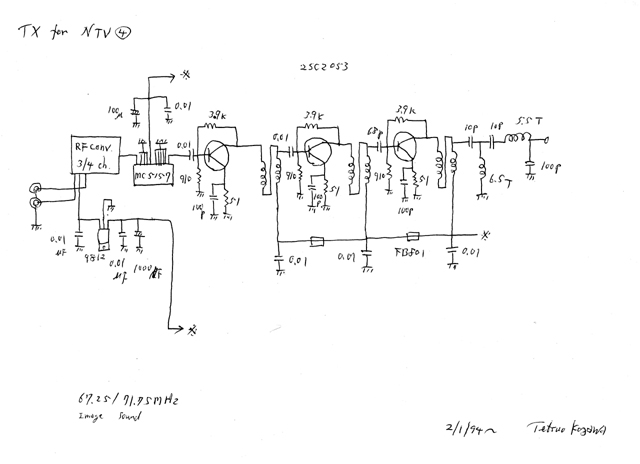 In 1994, Hank Bull and I had a NTV (non TV or net TV) project by using this method at Western Front in Vancouver. The Canadian plan of the TV channel starts from 55.25 MHz(ch.2) and the channel 3 (61.25 MHz) and 4 (67.25 MHz) that the ready-made VHF RF module for the American plan can select were open. It was a two week project to operate a micro television station at Western Front. It actually worked very well in 2 km radius. See the schematic (jpg) of the transmitter that I designed and used.