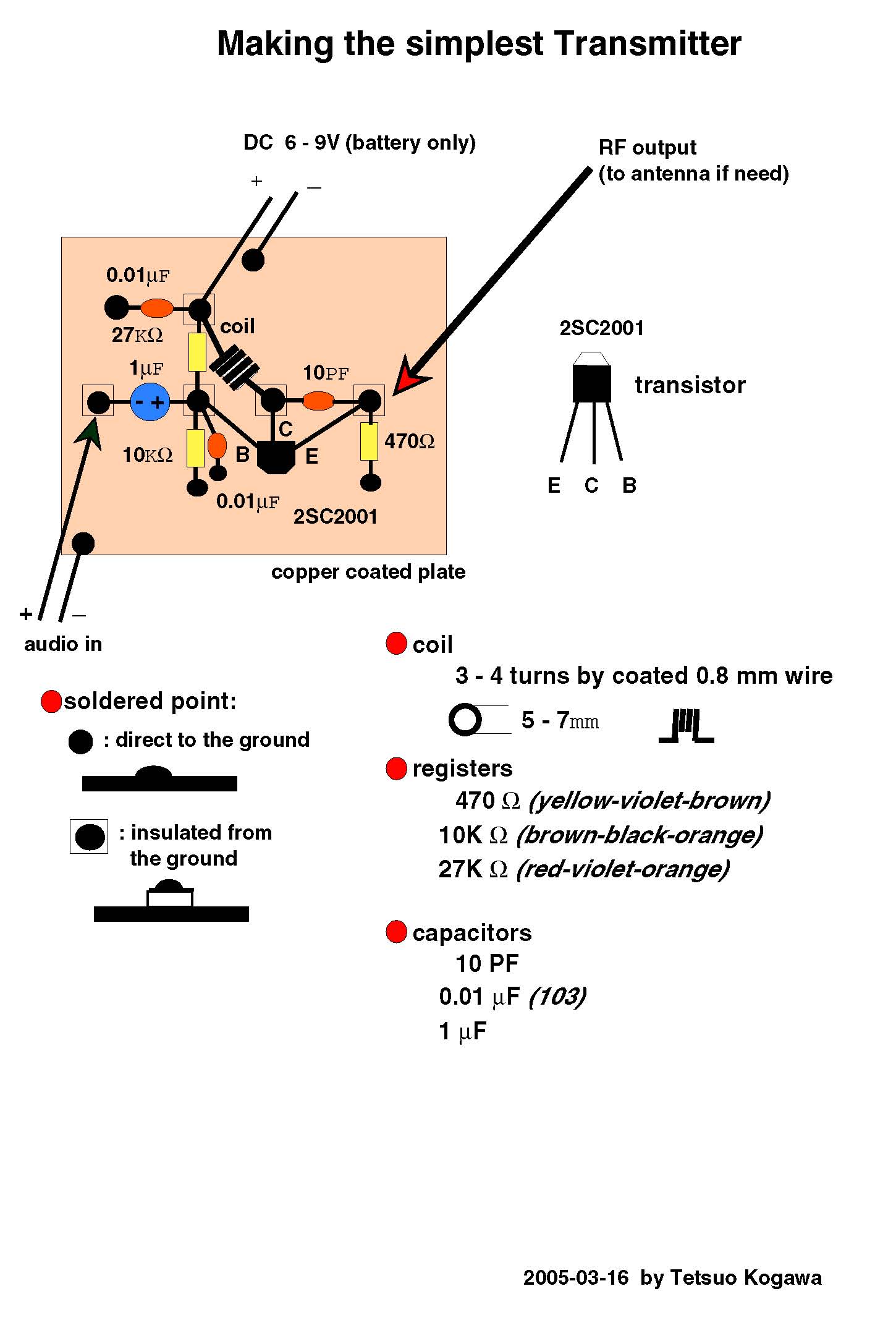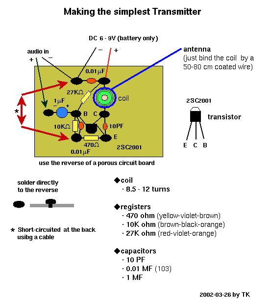 the complete diagram(pdf) of the simplest transmitter with a microphone in it. When this is acrobatically soldered, here(jpg) is the example.