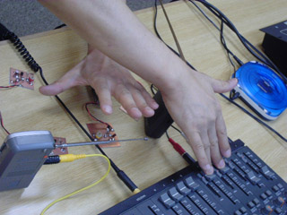 03:41 - 04:05 Tetsuo Kogawa's sound/hands performance with transmitters and receivers.
