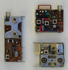 So, I took out the module from the VCR and soldered it to the booster circuit. Meantime, I obtained RF module units both for VHF and UHF in Akihabara (radio market in Tokyo). Using an unit for UHF, I built UHF TV transmitters. Since there were many choices in frequencies of UHF, the micro UHF stations worked well.