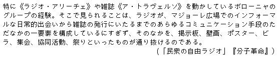 En particlulier l'experience du groupe de Bologne qui anime "Radio Alice" et