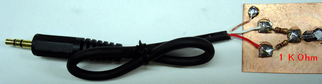 A: The earlier model of iPod has an automatic shut-down system in it. When you pull out the plug of your headphone, it automatically stops working. When the left and right channels are short-circuited, the same thing happens. Presumably, you use a stereo cable and soldered the left (white) and right (red) lead together. Please use the left channel lead (white) only. Usually the left output is compatible with mono audio. If you, however, insist to mix the left and right output of your audio source into the transmitter, make a simple "interface" like this by two sets of 1 kiro ohm registers.