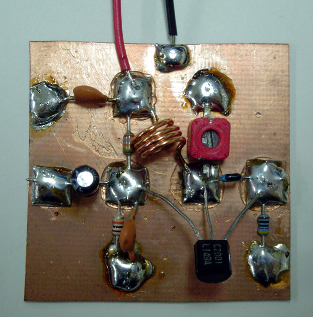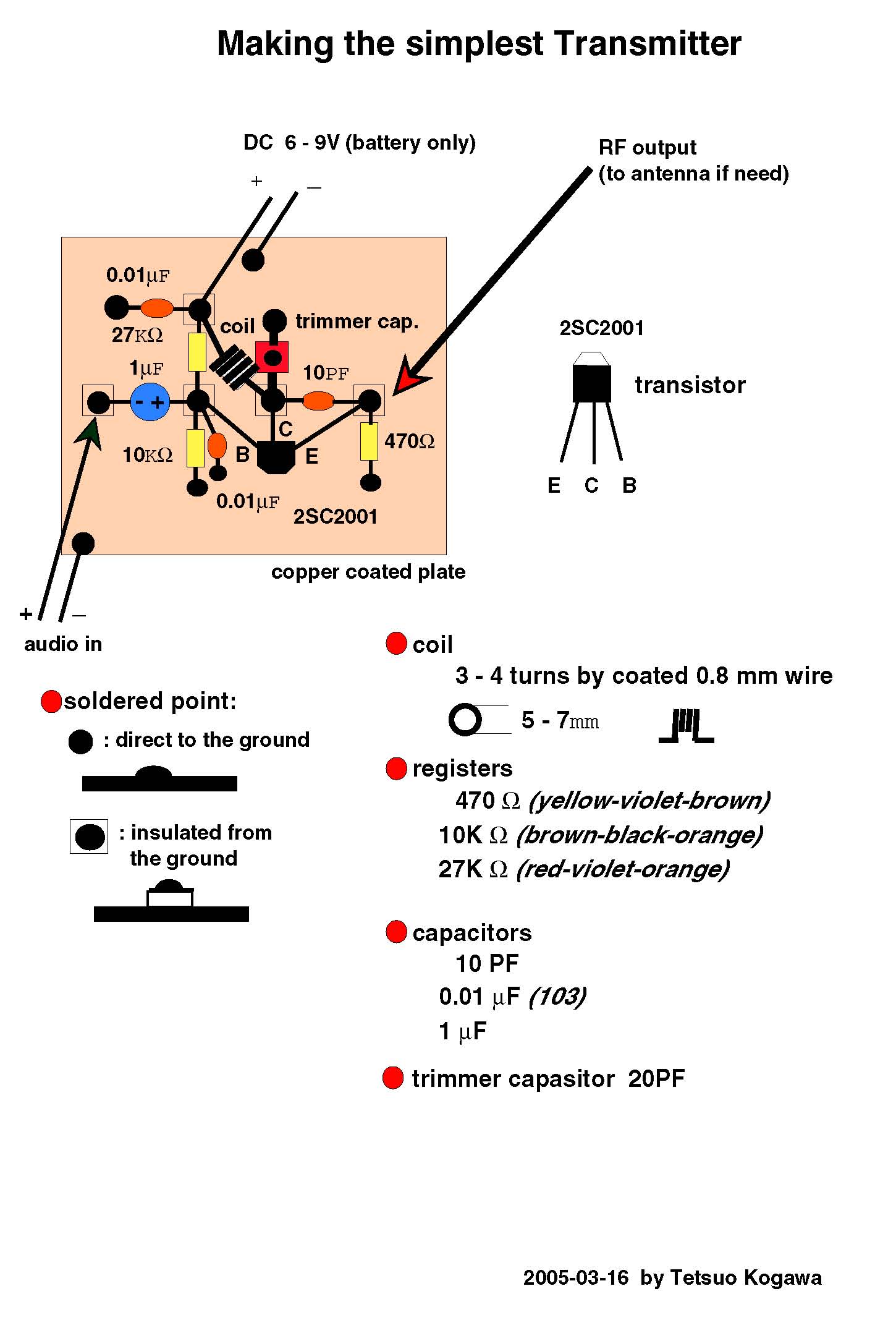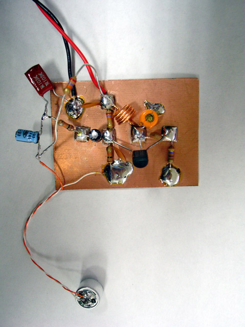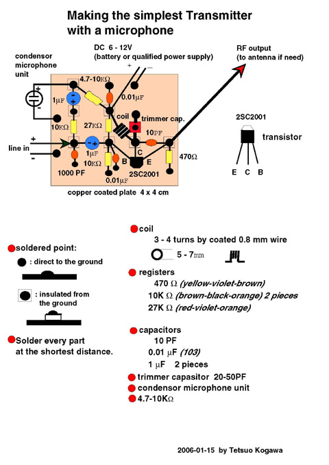 the complete diagram(pdf) of the simplest transmitter with a microphone in it. When this is acrobatically soldered, here(jpg) is the example.